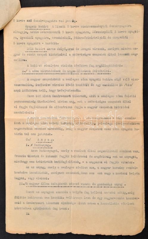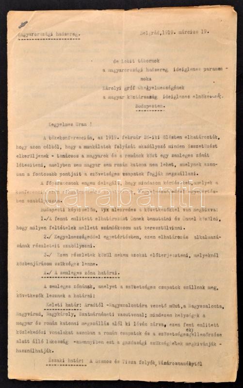 1919 A Vix-jegyzék első fordítása. Feltehetően a Berinkey-kormány ülésére néhány példányban készített eredeti gépirat. A jegyzék szövege alatt: "a fordításért Szilassy őrnagy" megjegyzéssel. Ferdinand Vix alezredes 1919. március 20-án délelőtt adta át Károlyi Mihály köztársasági elnöknek Paul de Lobit tábornok, a Belgrádban székelő francia Magyarországi Hadsereg parancsnokának előző napon kelt levelét, melyben újabb keleti országrészek kiürítését követelték az Antant hatalmak. A másnap, március 21-én összeült Berinkey kormány - a követeléseket sem teljesíteni, sem elutasítani nem merte - így lemondott, átadva a hatalmat a szociáldemokratáknak, akik a kommunistákkal kiegyezve kikiáltották a Magyar Tanácsköztársaságot.