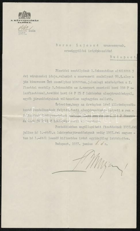 Leírás: 1937 Bp., Stranyovszky Sándor, a képviselőház elnöke által aláírt okmány