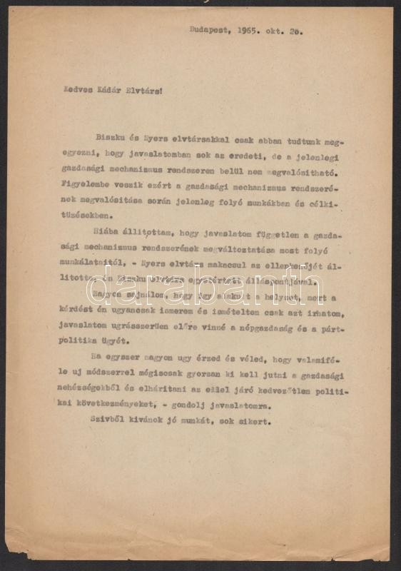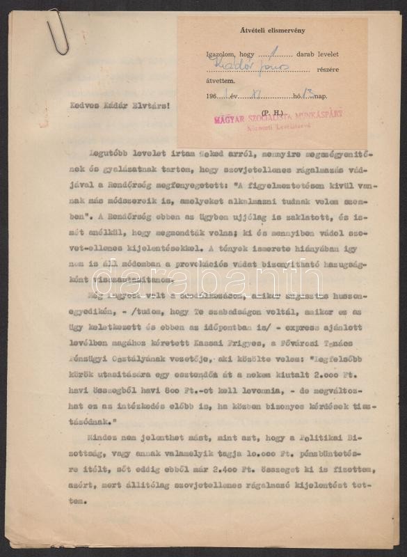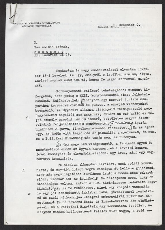 1957-1964 Vas Zoltán (1903-1983) 1956-os államminiszter, író és Kádár János személyes, olykor kölcsönösen sértő hangú levelezésének másolata: 3 Kádárnak írt levél, 4 válasz Kádártól, egy Biszkutól, egy Lukácstól, valamint Vas Zoltán 56-os szerepvállalása miatt indított elnöki tanácsi kegyelem másolata.