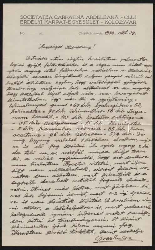 Leírás: Orosz Endre (1871-945.) erdélyi magyar régész, helytörténész. saját kézzel írt levele Szörényi Erzsébet (1904-1987) geológusnak