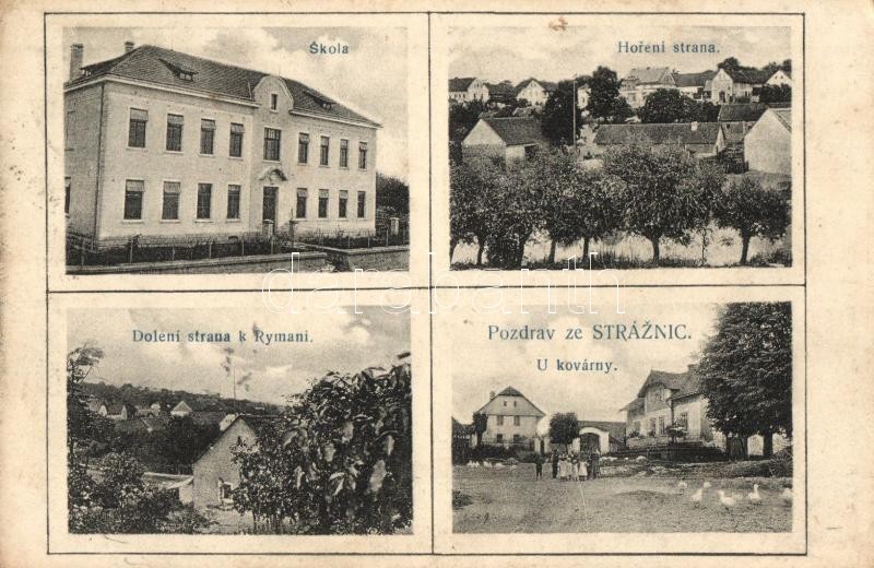 Leírás: Stráznice, Skola, Horení strana, U kovárny, Doleni strana k Rymani / school, forge (Rb)