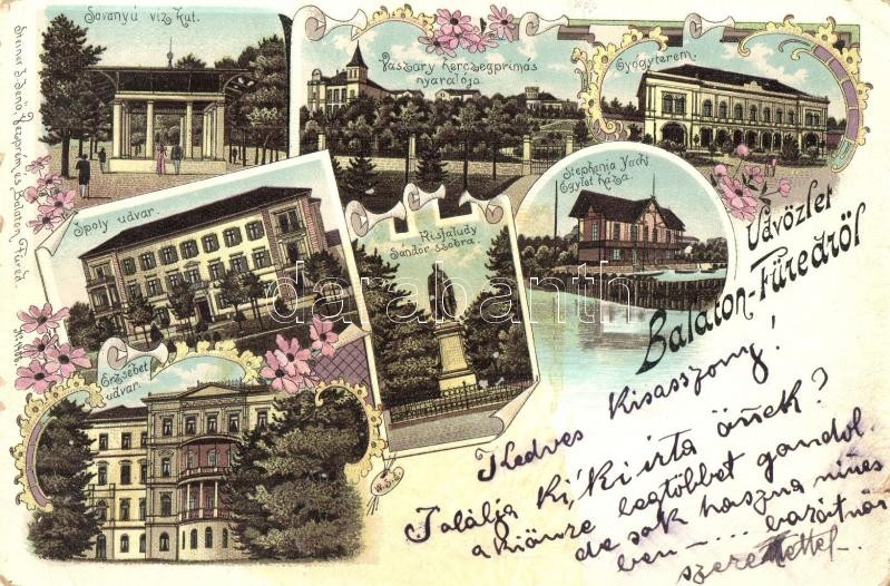 1898 Balatonfüred, Savanyú vízkút, Vaszary hercegprímás nyaralója, Gyógyterem, Stephania Yacht-egylet háza, Ipoly udvar, Erzsébet udvar, Kisfaludy Sándor szobra. Steiner J. Jenő kiadása floral Art Nouveau litho (kis szakadás / small tear)