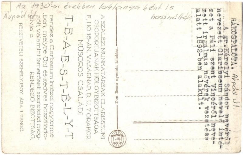 Leírás: Budapest XV. Rákospalota, Clarisseum nevelőintézet + hátoldalon meghívó teaestélyre (r)