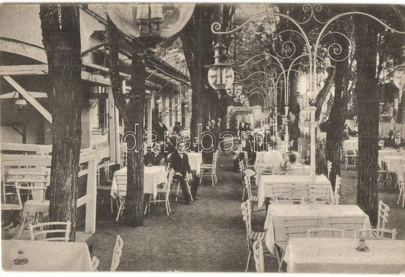 Leírás: Budapest XV. Rákospalota-Újpest, Horváth Imre nagyvendéglője a vasútállomással szemben, kerthelyiség (EK)