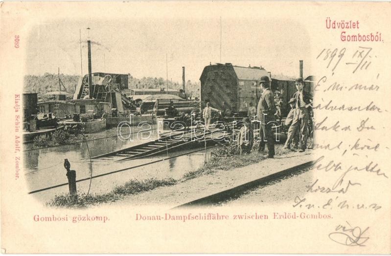 1899 Gombos, Bogojeva; Gőzkomp Erdőd és Gombos között, állomás kotróhajóval. Schön Adolf kiadása / Donau-Dampfschiffähre / steam ferry with locomotive and dredge