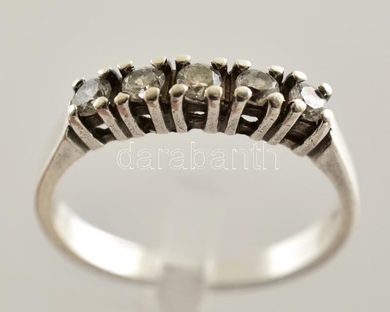 Ezüst(Ag) ötköves gyűrű, jelzett, méret: 52, bruttó: 2,3 g https://www.darabanth.com/hu/305-Gyorsarveres/305.0/Nemesfem-Disztargyak-Orak-es-Ekszerek/Nemesfem-Disztargyak-Orak-es-Ekszerek~300032/EzustAg-otkoves-gyuru-jelzett-meret-52-brutto-2-3-g~II1644159