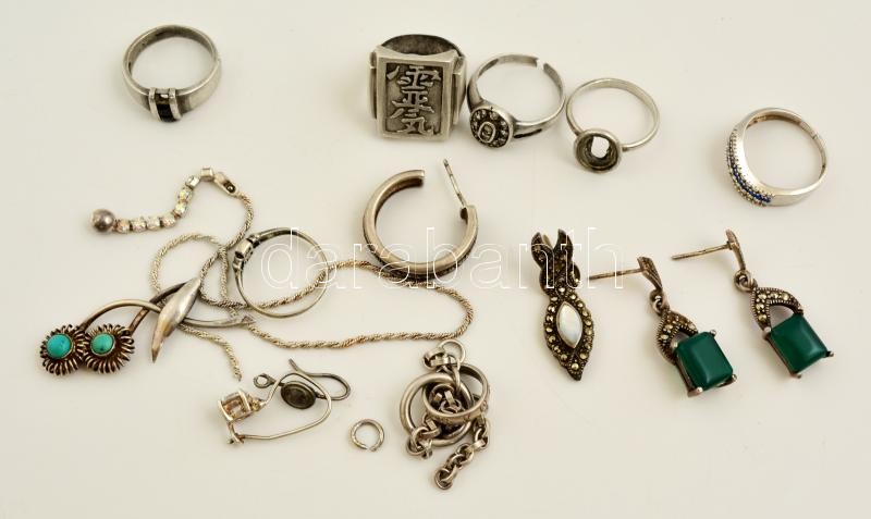 Leírás: Vegyes ezüst tétel, 15 db, köztük, gyűrűk, fülbevalók, láncok, egy részük jelzett, javításra szorulnak, bruttó: 35 g