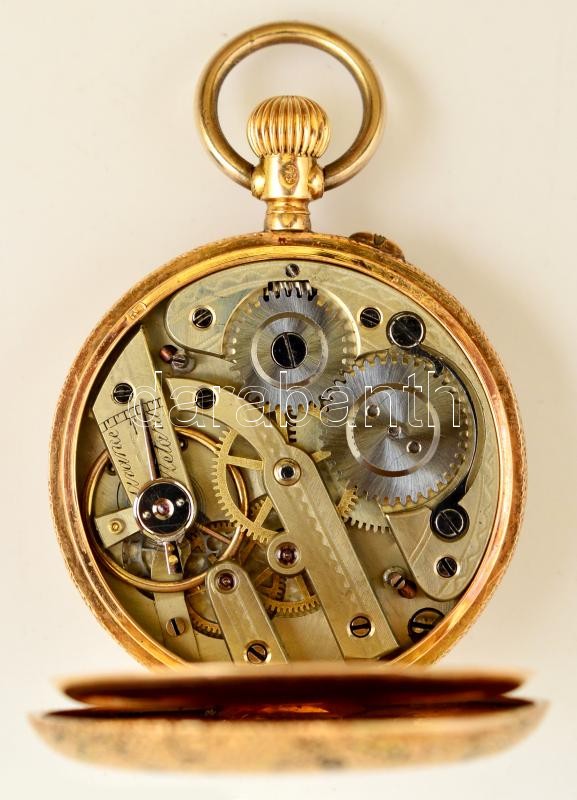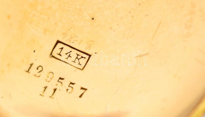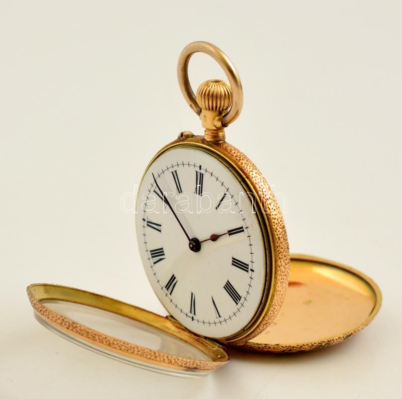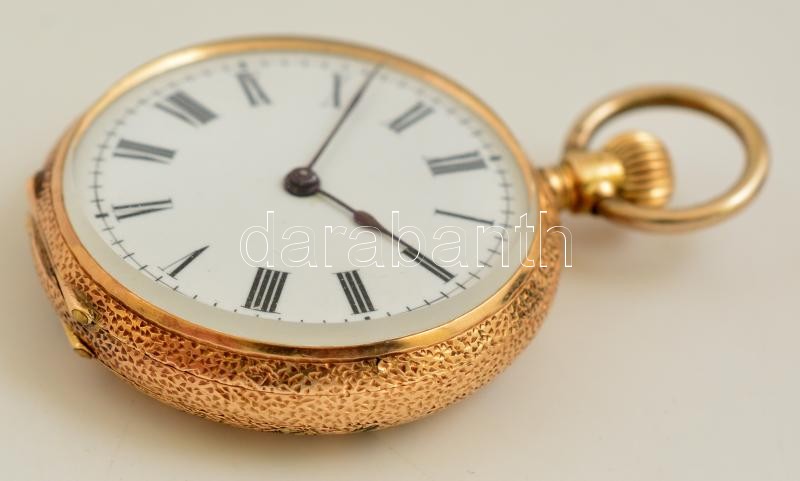 cca 1900 Arany női zsebóra, 14 K arany, hátlapján szép zománc díszítéssel. Svájci szerkezettel, nagyon szép, működő állapotban. cca 1900 / Vintage Swiss women's 14C gold pocket watch with enameled ornaments on the case d:3,4 cm, 31,2 g