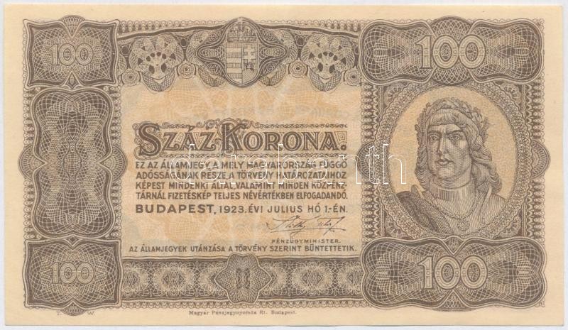 Leírás: 1923. 100K "Magyar Pénzjegynyomda Rt. Budapest" nyomdahely jelöléssel T:II