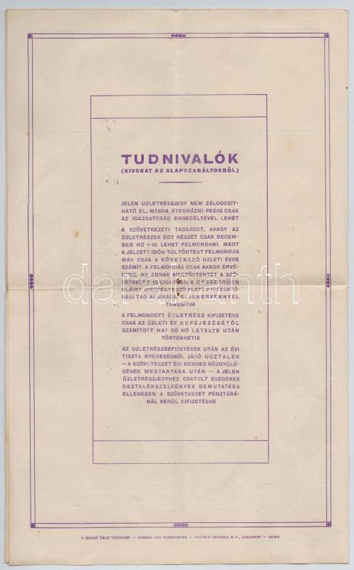 Alpár 1944. "Az Országos Központi Hitelszövetkezet" névre szóló üzletrészjegye "Alpári Hitelszövetkezet" bélyegzéssel, kézzel írt névértékkel és sorszámmal, szelvényekkel T:III
