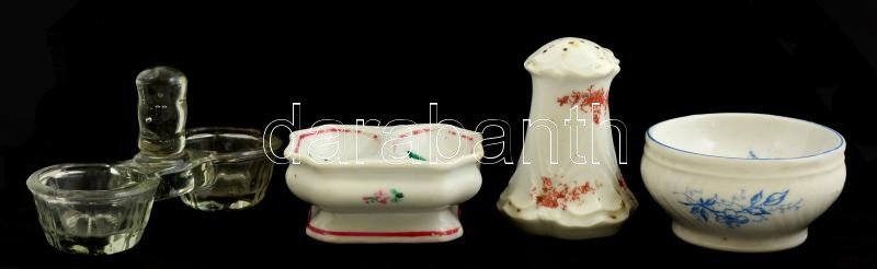 Leírás: 4 db régi porcelán és üveg fűszertartó