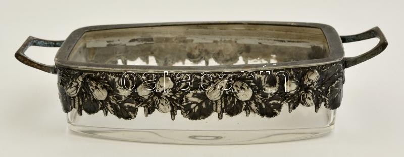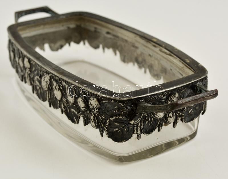 Leírás: Alpakka borítású kínáló, karcos üveggel, jelzés nélkül, 21×8 cm
