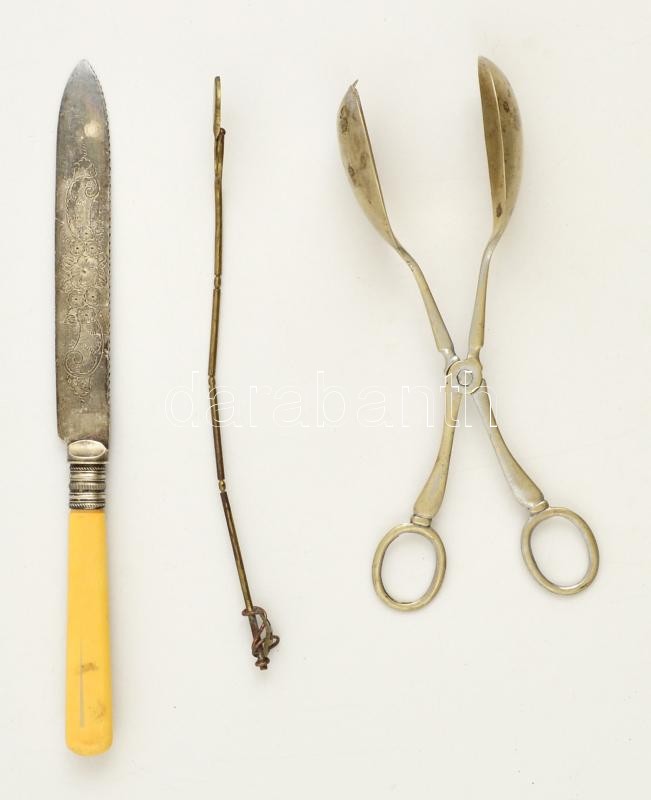 Leírás: Cizellát ezüstözött csontnyelű kés, alpaka süteményes kanál, réz koktél keverő, h:21-27 cm, összesen: 3 db