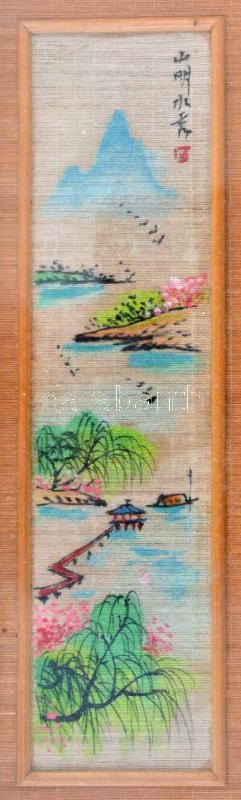 Leírás: Jelzés nélkül: Keleti tájkép, vegyes technika, bambusz(?), üvegezett fa keretben, 23,5×6,5 cm