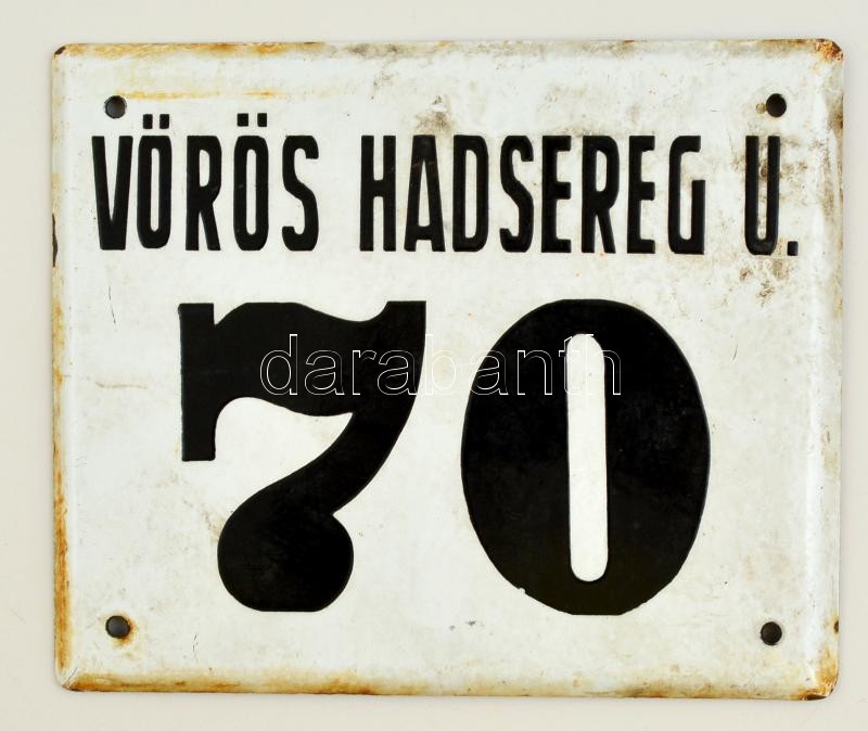 Vörös Hadsereg u. zománc utcanévtábla 18x16 cm https://www.darabanth.com/hu/306-Gyorsarveres/306.0/Festmeny-mutargy-papirregiseg-egyeb/Bolhapiac~100014/Voros-Hadsereg-u-zomanc-utcanevtabla-18x16-cm~II1657391