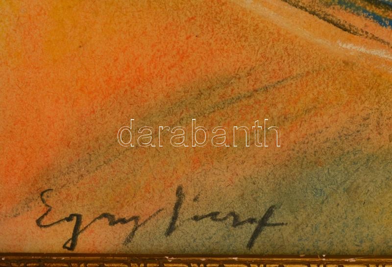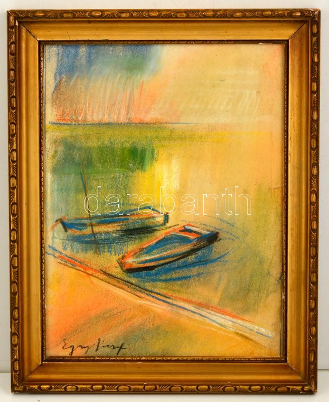 Leírás: Egry jelzéssel: Ladikok a balatoni naplementében, pasztell, papír, üvegezett fa keretben, 39×29,5 cm