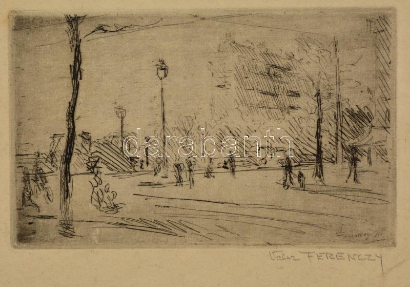 Leírás: Ferenczy Valér (1885-1954): Párizs, Place Denfert. Rézkarc, papír, jelzett, 9,5×16 cm