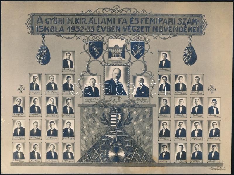 1933 Győr, a M. Kir. Fa és Fémipari Szakiskola tanárai és végzett diák... https://www.darabanth.com/hu/306-Gyorsarveres/306.0/Festmeny-mutargy-papirregiseg-egyeb/Foto~100022/1933-Gyor-a-M-Kir-Fa-es-Femipari-Szakiskola-tanarai-es-vegzett-diakjai-kistablo-36-neves~II1651407