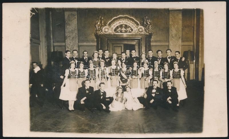Leírás: cca 1920-1930 Bálozó társaság magyaros ruhában, fotólap, 8x13,5 cm