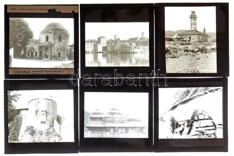 Leírás: cca 1920 Üveglemez diapozitív képek változatos témákról, 13 db vetíthető kép, az Uránia Szemléltető Taneszközök Gyárából, 8x8 cm