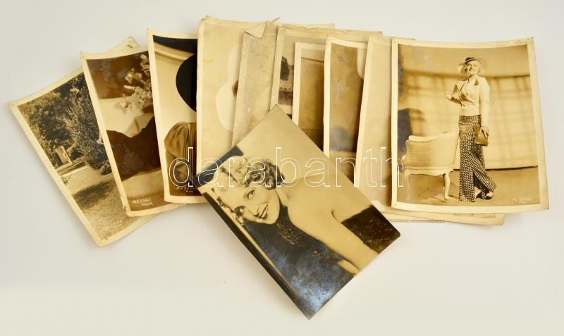 cca 1930-1940 Metro-Goldwyn-Mayer által foglalkoztatott színésznők fotói, divatfotók, 11 db, (Mary Carlisle, Isabell Jewell,Jeanette MacDonald,Mae Clarke, Diana Wynyard, Elizabeth Allen, Louise Henry, Gloria Swanson, Florine McKinney), hátul feliratozva, pecséttel jelzett, rossz állapotban, 23x16 cm és 25x20 cm közötti méretben.