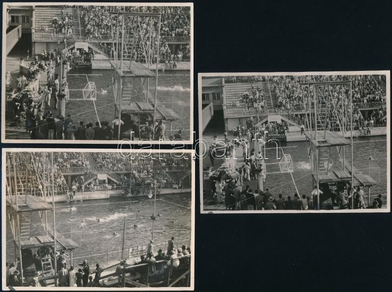 Leírás: cca 1930 Budapest, MTK-III. ker. vízilabda meccs a Sportuszodából, 3 db fotó, 8,5x12 cm