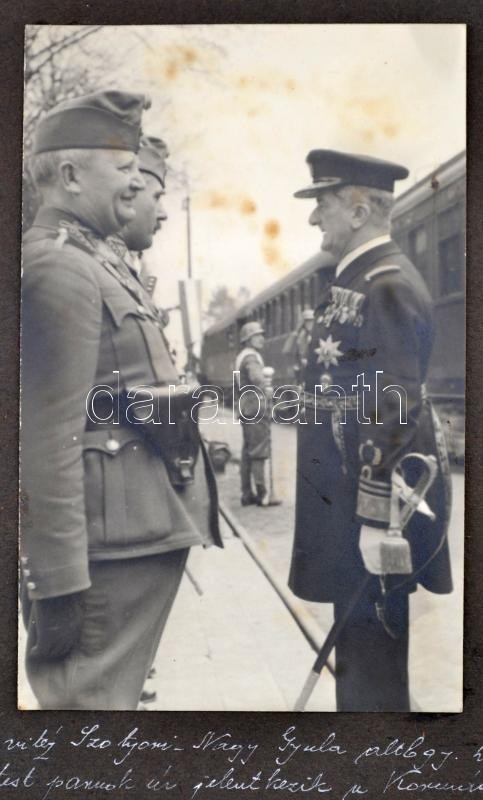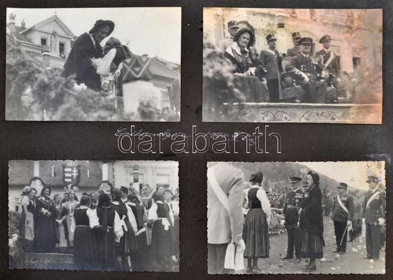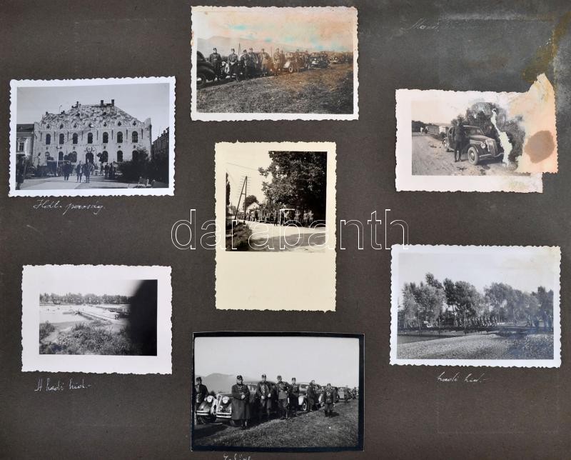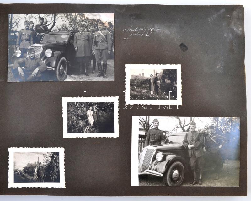 1940 "Székelyföld visszatért" Az erdélyi bevonulás képekben. Egyedileg összeállított fotóalbum 240 db képpel, köztük főként egyedi, érdekes fotóval a bevonuló magyar csapatokról, városok, haditechnika, Horthy Miklós és felesége, tábornokok, néhány képeslappal, 42 db fotó sérült, ázott, képméret: 4x3 és 9x14 cm között / 1940 Photo chronicle of the entry of Hungarian troops to Transylvania. 240 photos in album, with some postcards, 42 photos wet damaged