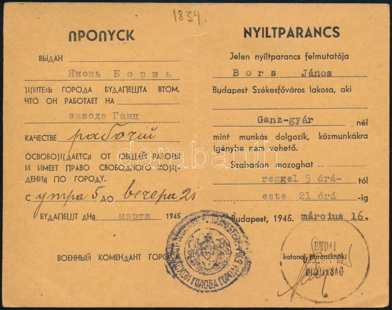1945 Nyíltparancs, Budai katonai parancsnokság által kiállítva, magyar... https://www.darabanth.com/hu/306-Gyorsarveres/306.0/Festmeny-mutargy-papirregiseg-egyeb/Militaria~100028/1945-Nyiltparancs-Budai-katonai-parancsnoksag-altal-kiallitva-magyar-es-orosz-nyelven-12x8c~II1651043
