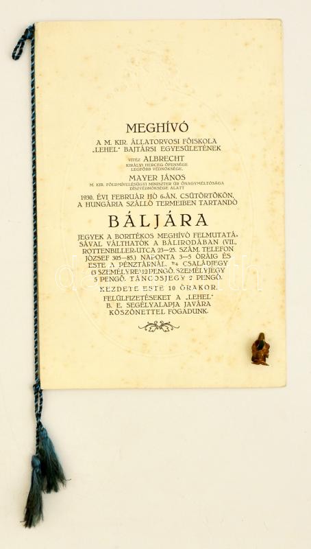 Leírás: 1930 Az Állatorvosi Főiskola Lehel bajtársi szövetségének dombornyomott meghívója, jelvénnyel