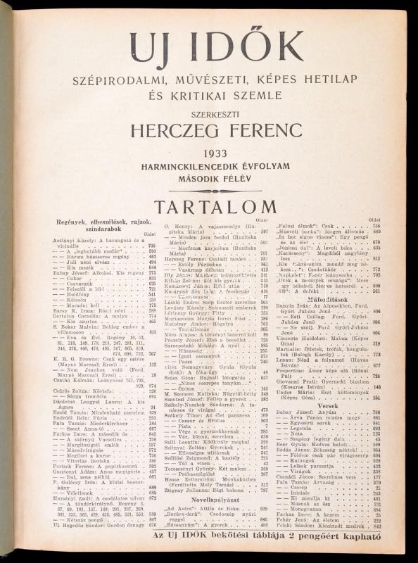 1933 Uj Idők. XXXIX. évfolyam. I-II. félév. (Teljes.) Szerk.: Herczeg ... https://www.darabanth.com/hu/306-Gyorsarveres/306.0/Festmeny-mutargy-papirregiseg-egyeb/Nyomtatvanyok~100030/1933-Uj-Idok-XXXIX-evfolyam-I-II-felev-Teljes-Szerk-Herczeg-Ferenc-Kiadoi-egeszvas~II1621866