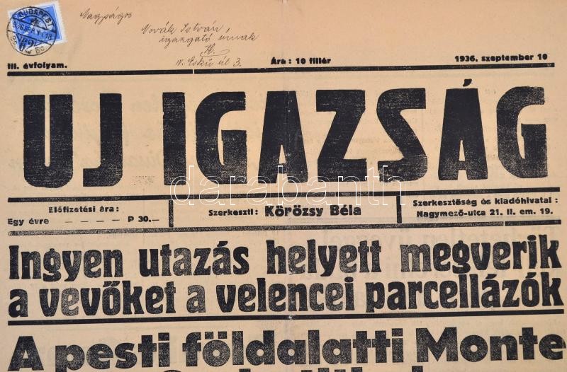 1936 Az Új Igazság III. évfolyamának szeptember 10-diki száma https://www.darabanth.com/hu/306-Gyorsarveres/306.0/Festmeny-mutargy-papirregiseg-egyeb/Nyomtatvanyok~100030/1936-Az-Uj-Igazsag-III-evfolyamanak-szeptember-10-diki-szama~II1653149