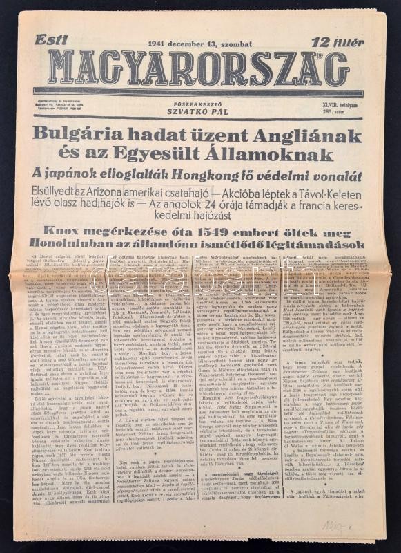 1941 Az Esti Magyarország XLVIII. évfolyamának 285. száma, háborús hír... https://www.darabanth.com/hu/306-Gyorsarveres/306.0/Festmeny-mutargy-papirregiseg-egyeb/Nyomtatvanyok~100030/1941-Az-Esti-Magyarorszag-XLVIII-evfolyamanak-285-szama-haborus-hirekkel~II1653047