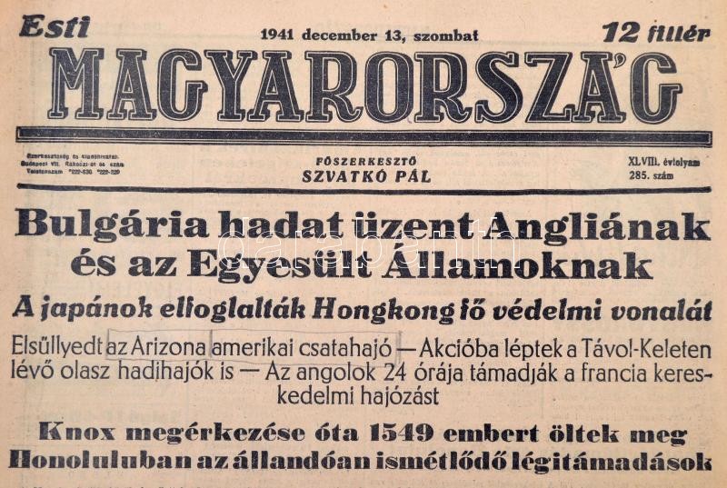 Leírás: 1941 Az Esti Magyarország XLVIII. évfolyamának 285. száma, háborús hírekkel