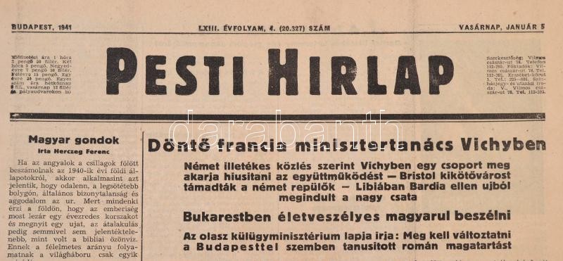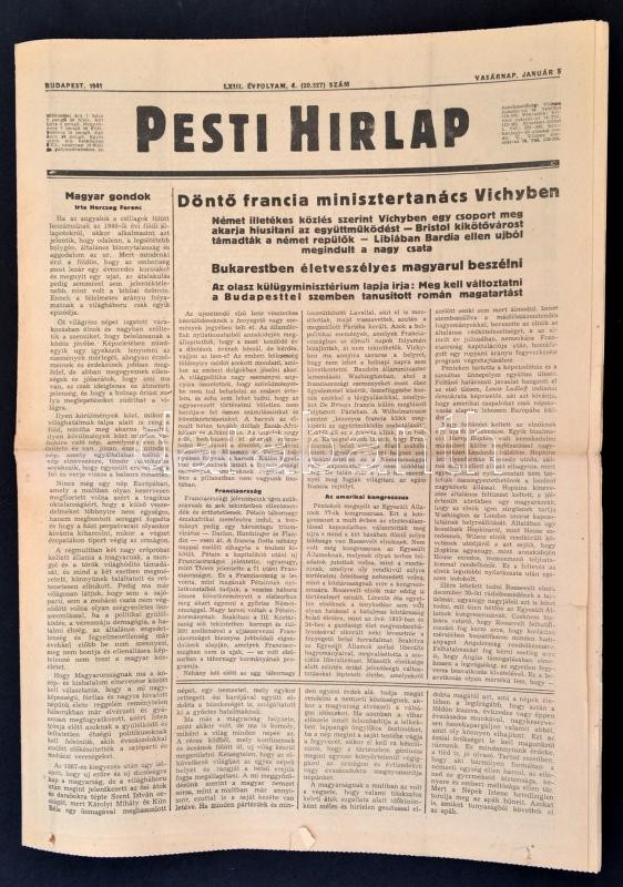Leírás: 1941 Bp., A Pesti Hírlap LXIII. évfolyamának 4. száma, háborús hírekkel