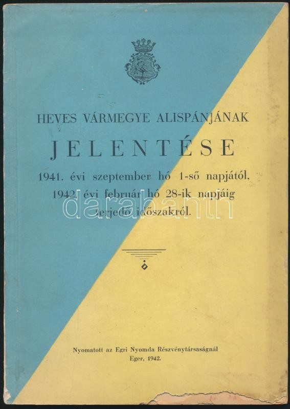 1942 Heves vármegye alispánjának jelentése 1941. évi szeptember jó 1-ső napjától 1942. évi február hó 28-ik napjáig terjedő időszakról. Eger, Egri Nyomda Rt. Papírkötésben, jó állapotban.