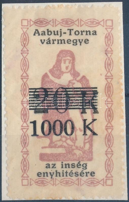 1924 Abaúj-Torna vármegyei ínségbélyeg 1000K/20K felcserélt betűkkel, ... https://www.darabanth.com/hu/306-Gyorsarveres/306.0/Festmeny-mutargy-papirregiseg-egyeb/Okmanybelyegek~100018/1924-Abauj-Torna-varmegyei-insegbelyeg-1000K20K-felcserelt-betukkel-negy-oldalon-fogazott-~II1623417