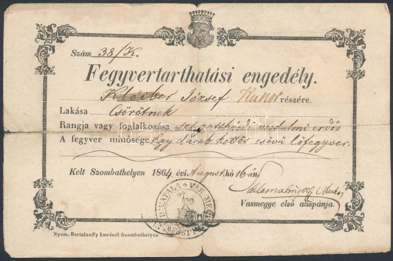 1864 Fegyvertartási engedély csörötneki lakos, uradalmi erdős részére ... https://www.darabanth.com/hu/306-Gyorsarveres/306.0/Festmeny-mutargy-papirregiseg-egyeb/Okmanyok~100019/1864-Fegyvertartasi-engedely-csorotneki-lakos-uradalmi-erdos-reszere-72kr-illetekbelyeggel~II1472034