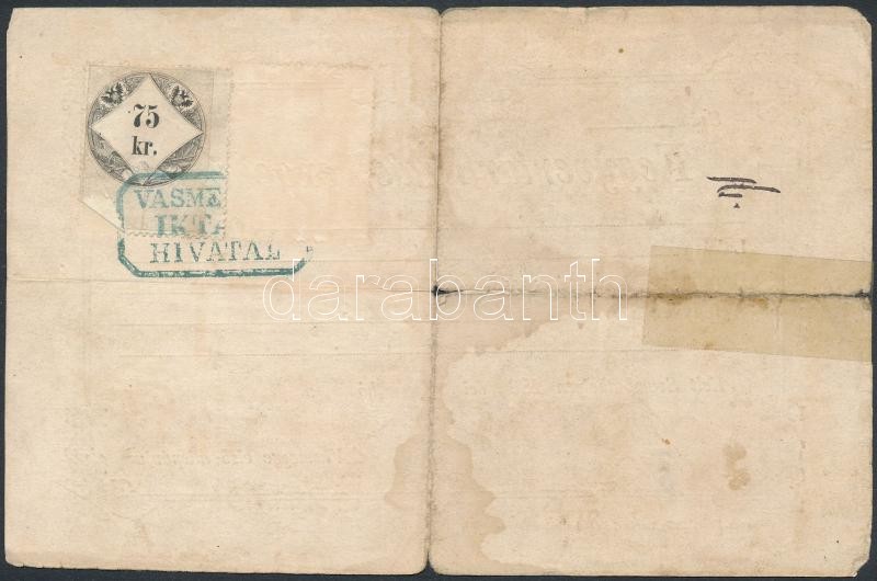 Leírás: 1864 Fegyvertartási engedély csörötneki lakos, uradalmi erdős részére 72kr illetékbélyeggel / 1862 Gun licence for village officer