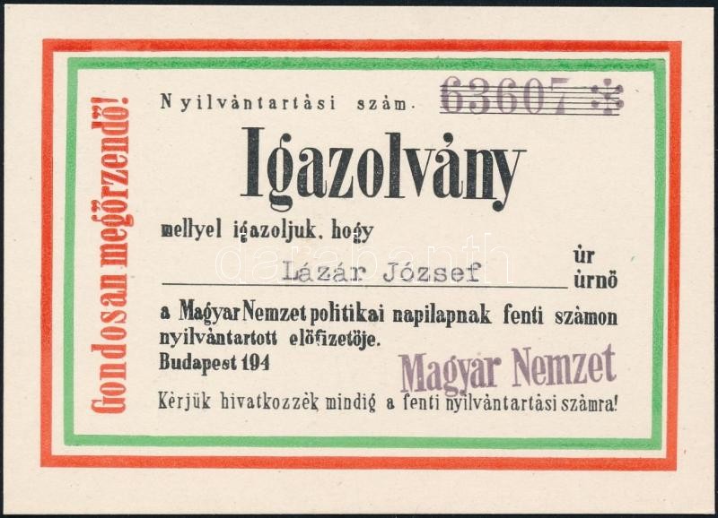 cca 1945 Magyar Nemzet előfizetői igazolvány https://www.darabanth.com/hu/306-Gyorsarveres/306.0/Festmeny-mutargy-papirregiseg-egyeb/Okmanyok~100019/cca-1945-Magyar-Nemzet-elofizetoi-igazolvany~II1655600