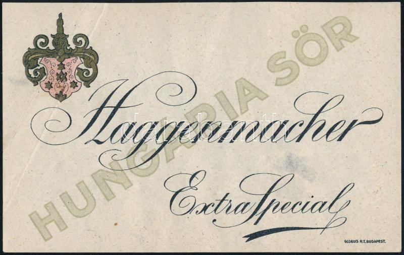 Leírás: cca 1910 Hungária Sör, sörcímke, Haggenmacher, Globus Rt., 7x12 cm