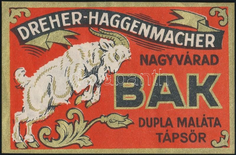 Leírás: cca 1920 Bak, dupla maláta tápsör, sörcímke, Dreher-Haggenmacher Nagyvárad, lito, 7x11 cm.