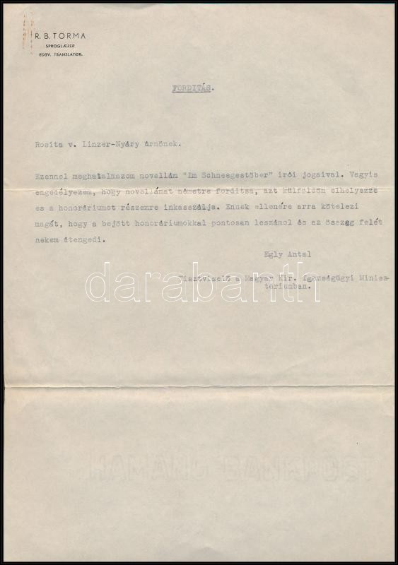 Leírás: 1939 Br. Nyáry László névjegye, hátulján kézzel írt soraival + Nyáry Rositával kapcsolatos iratok