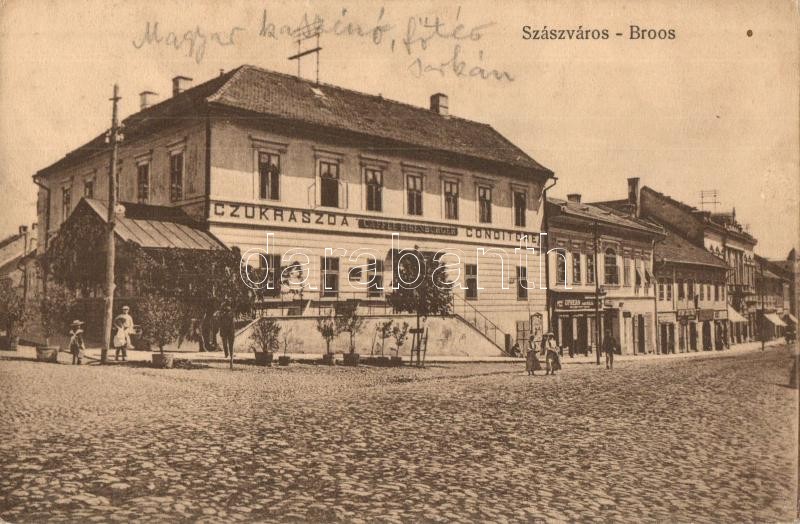 Leírás: Szászváros, Broos, Orastie; utcakép, Eisenburger kávéház és cukrászda, Oprean Aurél üzlete / street view, confectionery, café, shops (ázott sarok / wet corner)
