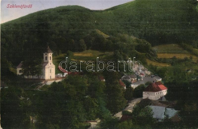 Leírás: Szklenófürdő, Sklené Teplice; látkép templommal / panorama view with church (kissé ázott / slightly wet damage)