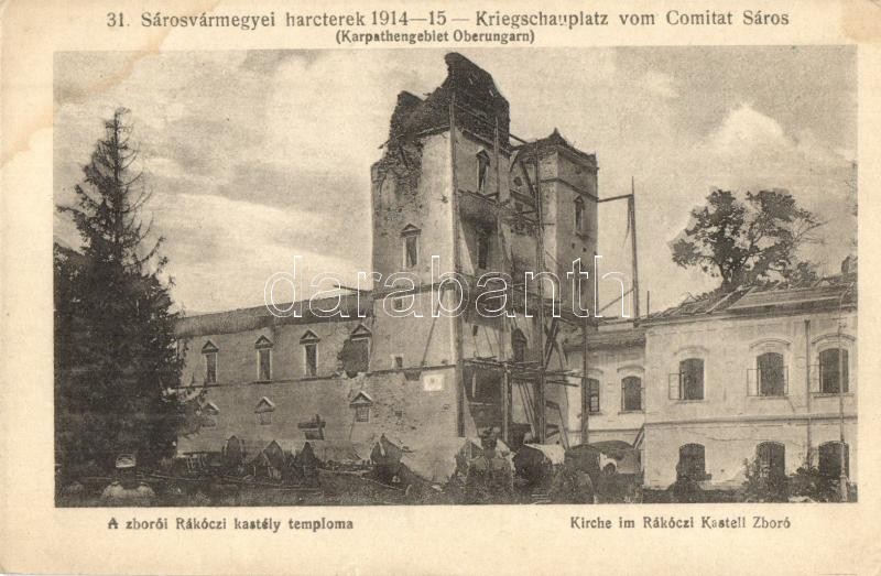 Zboró, Zborov; lerombolt Rákóczi kastély templom, katonák; 31. Sáros vármegyei harcterek 1914-15, Fritz Antal kiadása / destroyed castle church, soldiers (EK)