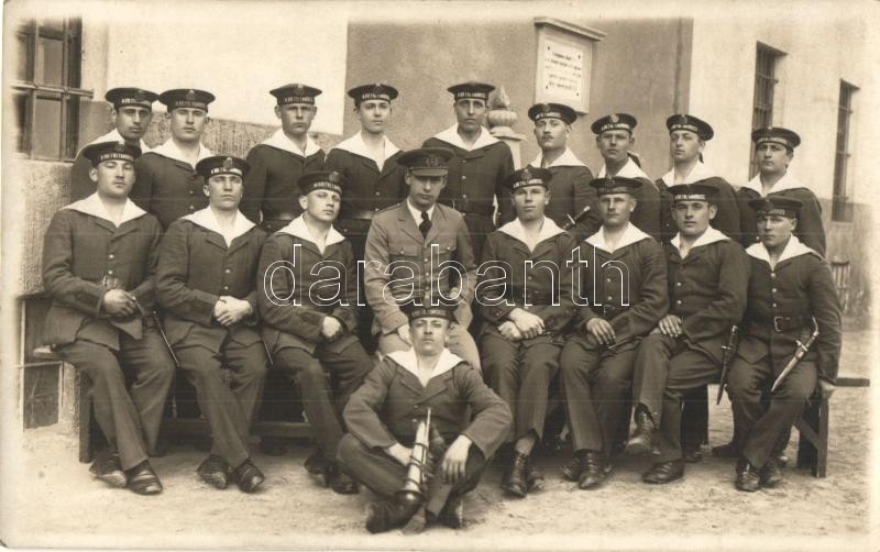 A Magyar Királyi Folyamőrség matrózainak csoportképe az emléktábla előtt. Dunai Flottilla / Donau-Flottille / Hungarian Danube Fleet river guards' group in front of the memorial plaque, photo