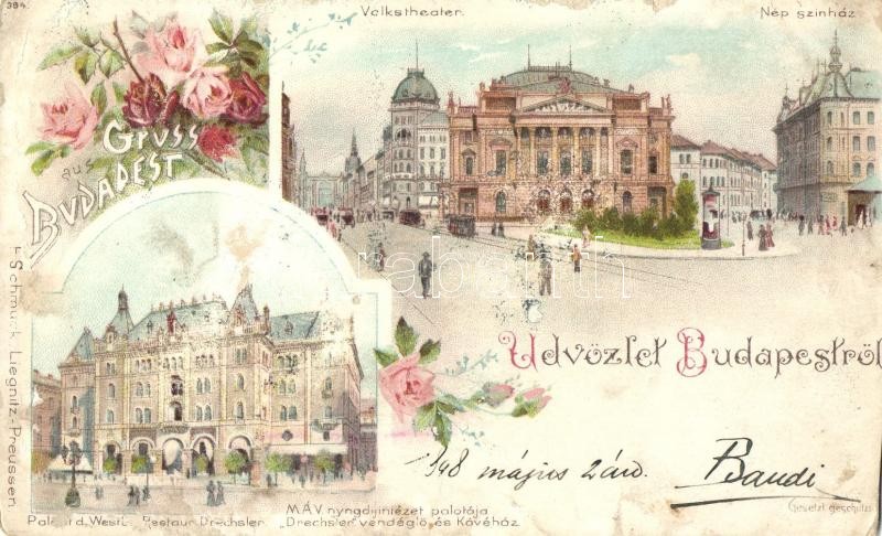 Leírás: 1898 Budapest, Népszínház, MÁV Nyugdíjintézeti palota, Drechsler vendéglő és kávéház. Floral, litho (vágott / cut)