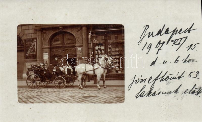 Leírás: 1907 Budapest VIII. József körút 53. lovaskocsi, vászon és szövetáru üzlet, photo