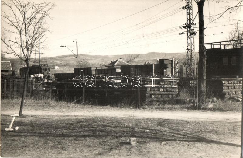 Leírás: 1944 Veresegyház, vasútállomás vonattal. Fekete László fényképész írása és pecsétje, photo