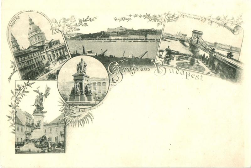 Leírás: Budapest, Bazilika, Deák szobor, Lánchíd, Honvéd szobor. Art Nouveau, floral
